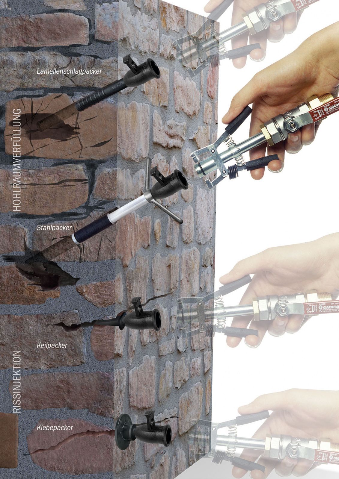 - Reinigen (z. B. mit Druckluft) und vorbereiten der Bohrlöcher, je nach Füllstoff Packer setzen und verspannen (bei trockenen Rissen Rissflanken vornässen)