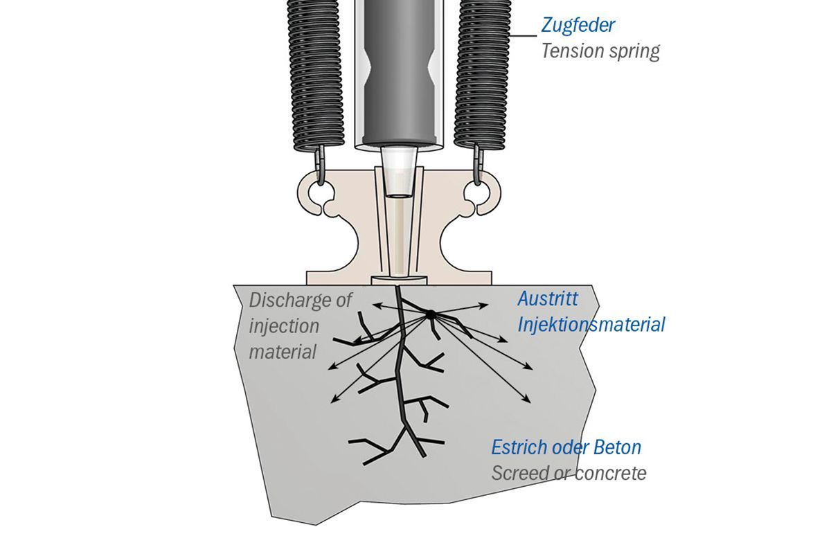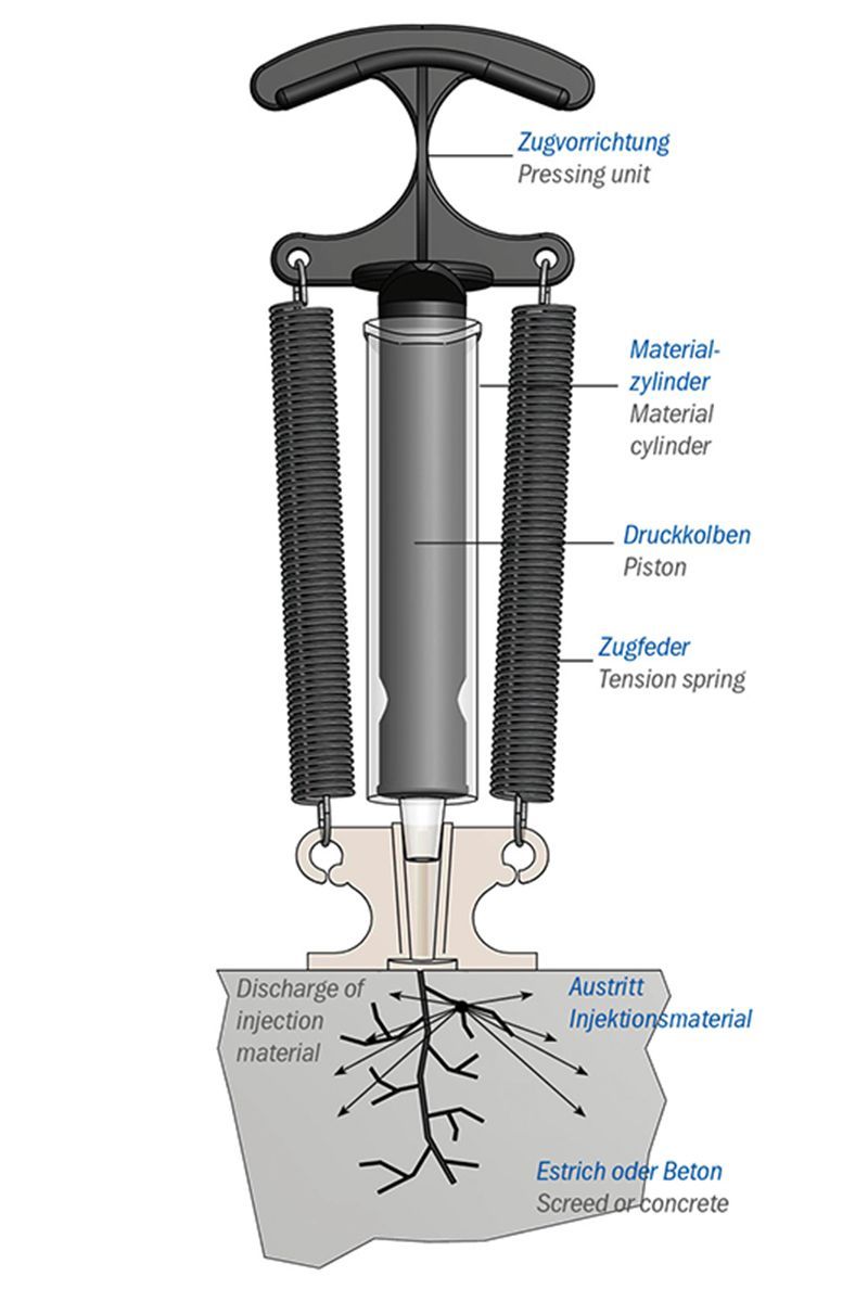 Die selbstinjizierende Injektionsvorrichtung wird eingesetzt, wenn wenig Druck (ca. 1 bar) und eine lange Verweilzeit zur Sicherstellung des Injektionserfolges benötigt wird (z. B. bei sehr feinen Rissen)