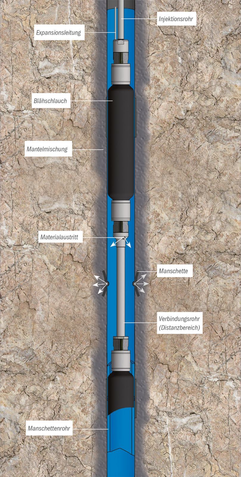 Die Doppel-Blähpacker Flex werden hauptsächlich für Injektionen mit Manschettenrohren eingesetzt. Die Injektionen dienen der Verbesserung von mechanischen Eigenschaften, zur Abdichtung oder zur Verfestigung von Boden, Fels, Bauteilen usw.Anwendungsbeispiele