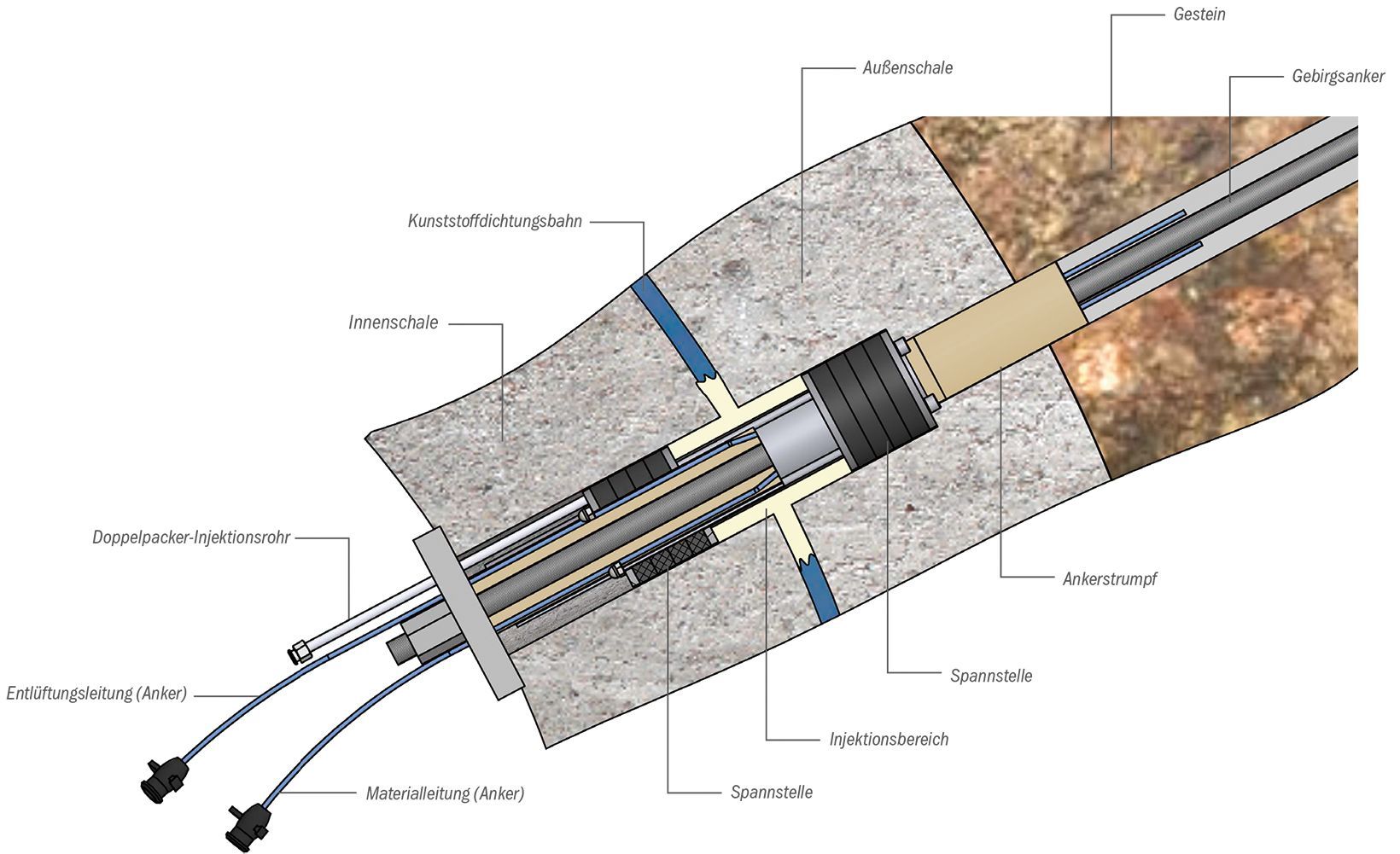 Mit Hilfe der 4 axialen Spannschrauben wird der Doppelpacker fest im Bohrloch verspannt. Durch das Injektionsrohr wird nun das Abdichtungsmaterial in die Fehlstellen, die aufgrund des Durchbohrens der Kunststoffdichtungsbahn entstanden sind, eingebracht, um die Dichtigkeit wiederherzustellen. Über die Materialleitung im Ankerstrumpf kann der DESOI Ankermörtel in das Bohrloch eingefüllt werden.