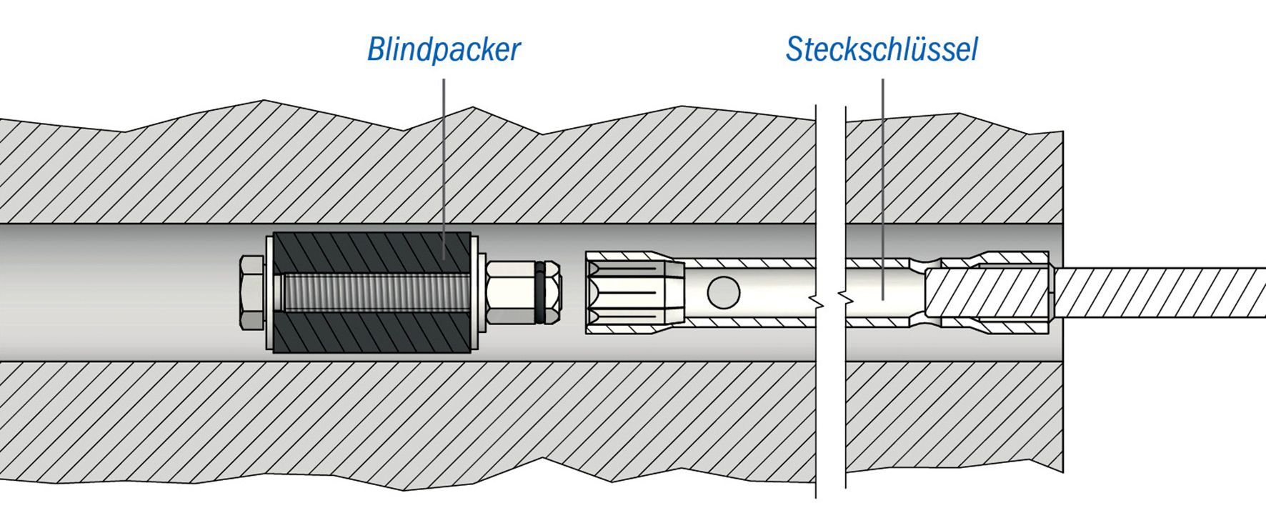 • Das Verspannen der Blindpacker in den Öffnungen erfolgt mit einem Steckschlüssel über die Anzugsmutter