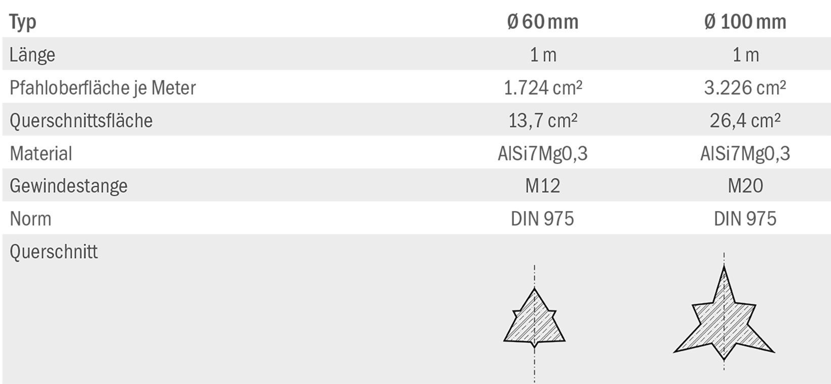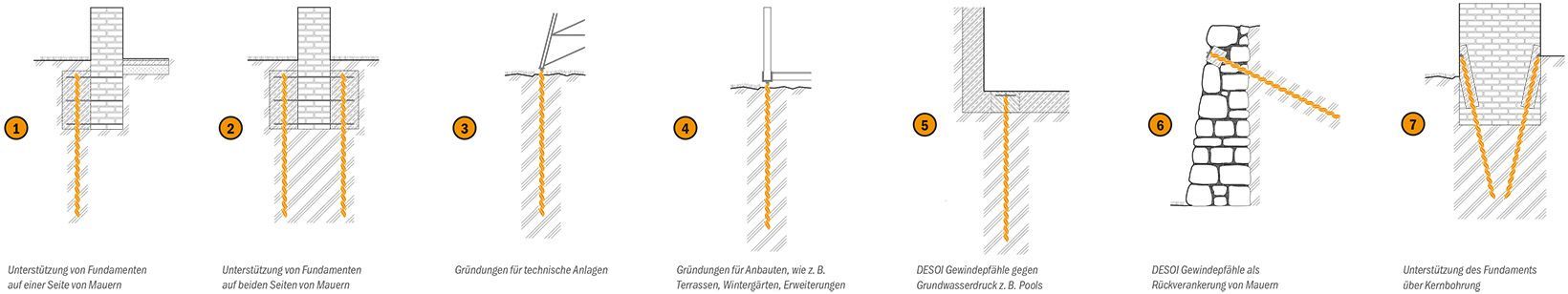 ermöglichen die Realisierung der Gründung oder Gründungsertüchtigung eines Bauwerkes in sehr kurzer Zeit. Das geringe Gewicht und der einfache Einbau sind für den Einsatz in fast jedem Baugrund und jedem Ort geeignet. Die Spiralform der Gewindepfähle erzeugt ein einzigartiges Verhältnis des Querschnitts zur Gesamtoberfläche zum Eintrag hoher Zug- und Druckkräfte in den Baugrund.