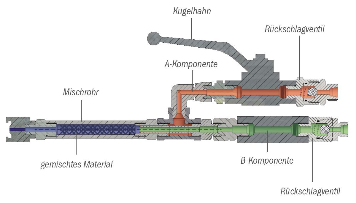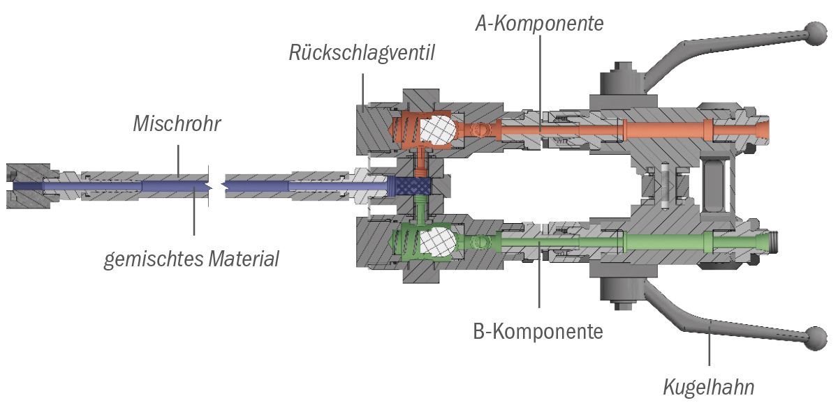 Bei den Mischköpfen werden die A- und B-Komponente kurz vor dem Statik-Gittermischer zusammengeführt und im Statik-Gittermischer gemischt. Durch die beiden Rückschlagventile fliest das Material nicht in die Materialschläuche zurück. Die Mischstrecke kann durch unterschiedliche Mischrohre und die Anzahl der Statik-Gittermischer an das Injektionsmaterial angepasst werden.