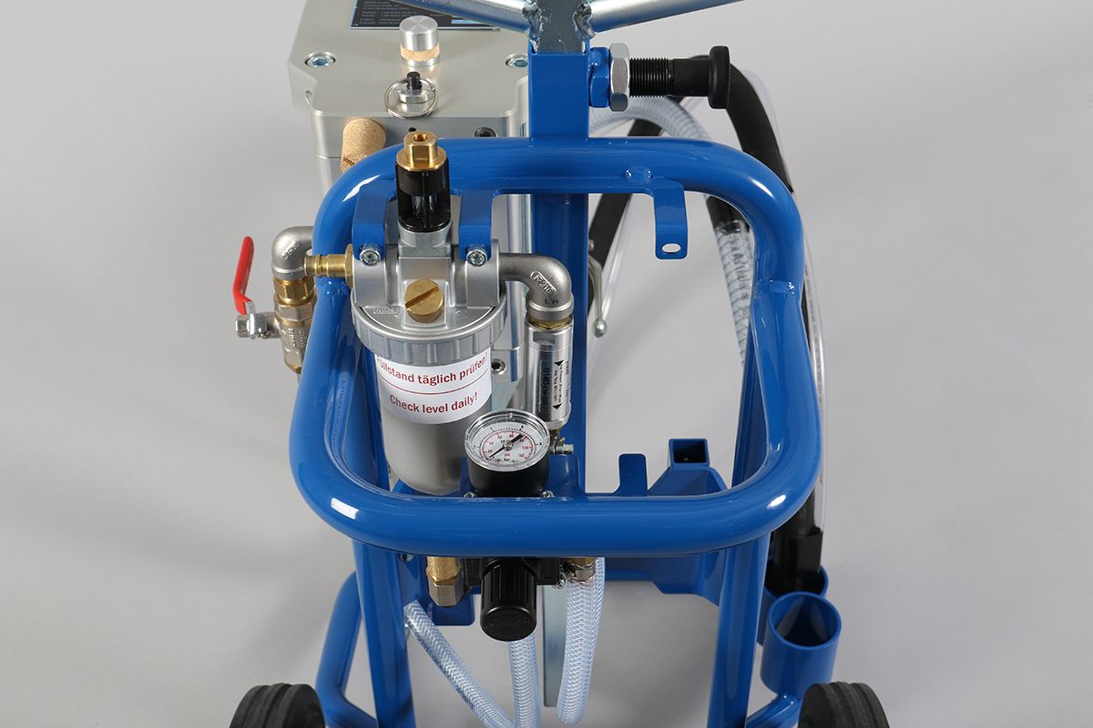 Die Kolbenpumpe DESOI AirPower M25-2C ist mit einer Zwangssteuerung ausgestattet. Sie fördert das Material im festen Mischungsverhältnis 1:1. Eine hohe Förderleistung und Mischgenauigkeit werden durch die großen und exakt arbeitenden Ventile erzielt. Die Pumpe ist sehr wartungsfreundlich und verschleißarm. Durch ihr geringes Gewicht ist diese flexibel auf der Baustelle einsetzbar.