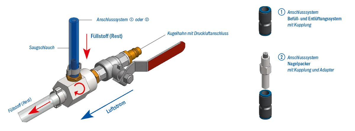 Durch den mit der Vakuumzugvorrichtung erzeugten Unterdruck wird der Injektionsschlauch von überschüssigem Füllstoff (Harz, Zement, Acrylatgel) befreit. Mit Hilfe eines Adapters, kann die Vakuumzugvorrichtung auch bei Verwendung von Nagelpackern eingesetzt werden.
